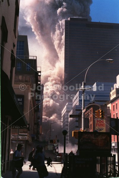 11 September 2001 – New York – Smoke pours from the World Trade Center complex following a terrorist attack September 11, 2001. PHOTO CREDIT: Joseph Woolhead / SIPA PRESS