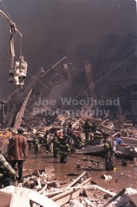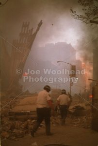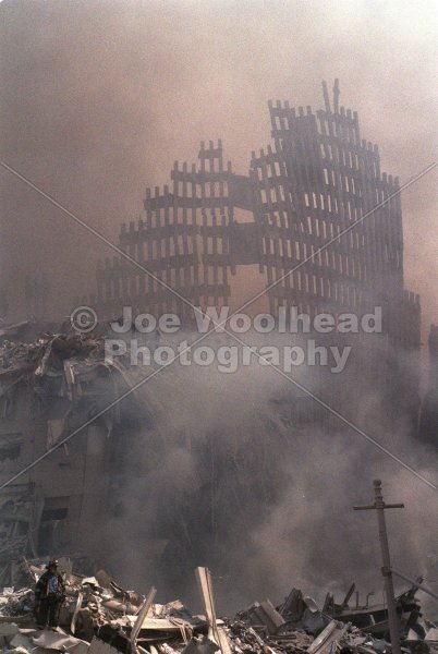 11 September 2001 – New York – Rubble near the base of the World Trade Center complex following a terrorist attack September 11, 2001. PHOTO CREDIT: Joseph Woolhead / SIPA PRESS